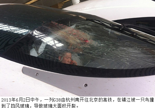 根据2013年6月3日的《现代快报》报道,6月2日中午,一列G38由杭州南开往北京的高铁,在镇江被一只鸟撞到了挡风玻璃,导致玻璃大面积开裂,最终列车开到南京南站后全体乘客换车,受伤列车则进行修理。飞鸟撞停高铁,这究竟是一只什么鸟?