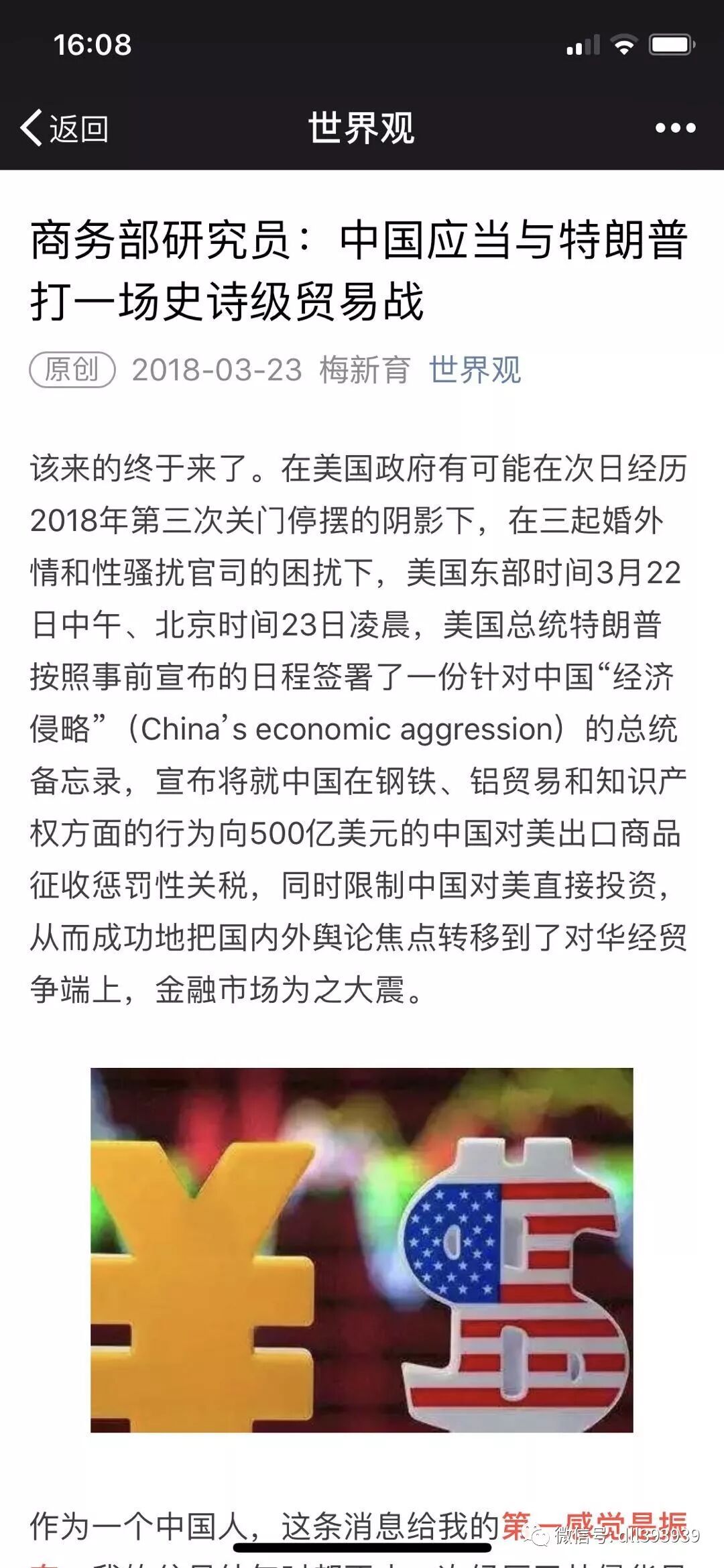 今天商务部的一位研究员发表了这样一篇文章:《中国应当与特朗普打一场史诗级贸易战》,这很有点军方国际问题学者的味道。