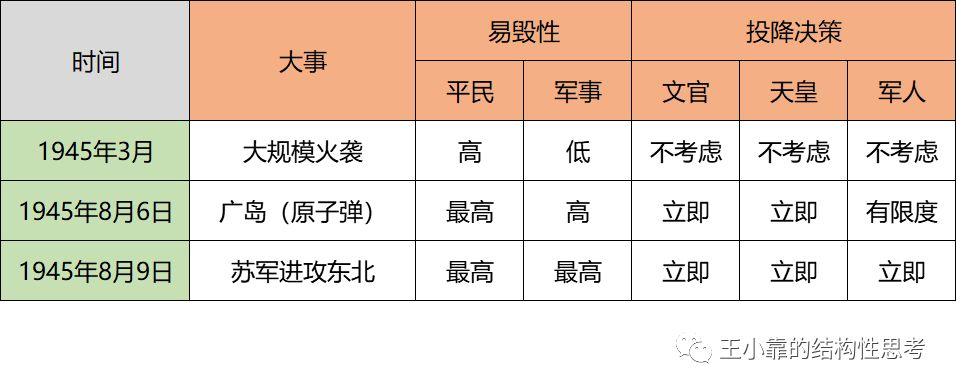 如果我们把战争进程与文人、天皇、军队三方关于投降态度的关系做成一个表格,那么就是这样: