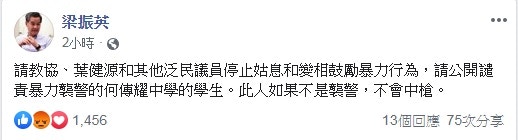 「01觀點」已不只一次指出,這名前特首應謹言慎行,不要再在香港掀起鬥爭風氣。當已經有學生中槍受重傷,我們希望社會各界均能同心協力,促進社會降溫甚至和解。就此,「01觀點」再次嚴正指出:香港已經夠亂了,市民之間的敵視情緒已經夠深,梁振英這名前特首絕對不應該再添柴添火,特別是對不同學校指指點點,狙擊學生、老師或校長。梁振英先生,請還香港社會寧靜。