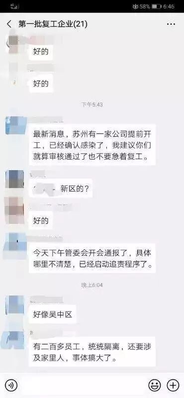 2月10日,一张群聊天记录截图在网上和朋友圈被转发:“最新消息,苏州有一家公司提前开工,已经确认感染了……有200多员工,统统隔离……”引起市民诸多恐慌。