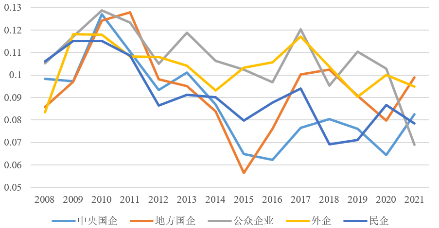 我们还可以将国企和民企进行对比,因为缺乏全样本数据,我们采用上市公司数据进行分析。在A股上市的企业可谓中国企业中的绩优生,因此采用A股的数据,会存在一定的偏误,总的来说,央企上市的比例非常高,能相对代表央企的平均水平,但上市的民企和地方国企则是优中之优,无法代表民企的总体情况。 如图4所示,能上市的民企,其ROE表现得很好,虽然不如外企,但与中央国企互有胜负,这表明绩优的民企其盈利能力并不弱于中央国企,而在A股上的央企之所以创造了那么多的利润,主要是资产规模庞大导致的,其ROE水平并不高。