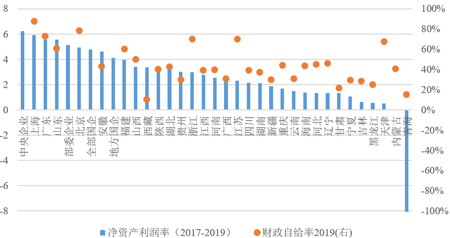 按之前的分析,我们消除资产规模的影响,看ROE(净资产收益率)的水平。因为数据原因,我们仅有2019年以前的地方国企的ROE表现,为了排除单独一年的波动,我们采用2017-2019年的3年算术平均进行比较。央企、部委企业、地方国企的ROE分别为6.2%、5.1%和4.1%,盈利能力依次降低。深入到地方各省区之间,央企仍然是一枝独秀,上海、广东、山东次之,在5.6-5.9%之间。上海、广东是中国市场经济最活跃的地区,而部委企业的赢利水平排在山东后面,相当于省份排名中的全国第四。至于地方国企,如图3所示,整个地方国企的水平为4.12%,仅有5个省超过了全国平均水平。所有的中西部地区和大多数东部省份国企的ROE都低于全国国企的平均水平。如果将净资产收益率与地方财政自给率、地方债务水平、人均GDP大体上呈现一定的相关性,自给率越高、人均GDP越高、人均债务水平(相对于人均财政收入)越低,地方国企的ROE就越好。